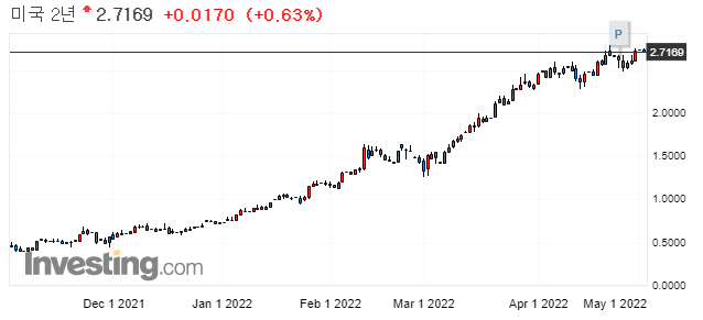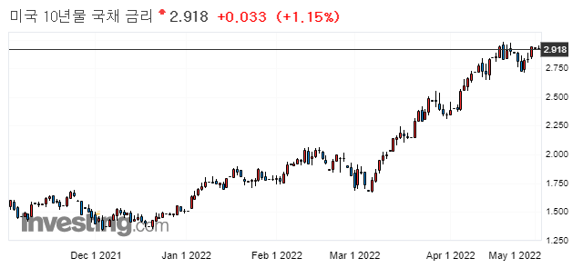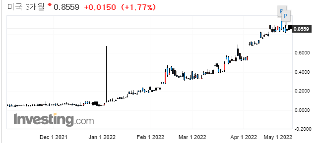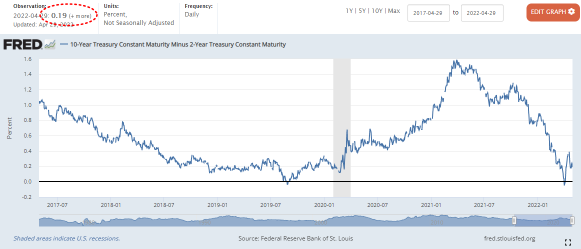 0.22%에서 0.03%하락한 0.19%마감 (22년 4월 1일자로 장단기 금리차 역전)