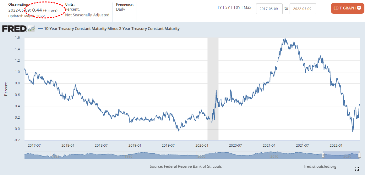 0.27%에서 0.13%상승한 0.40%마감 (22년 4월 1일자로 장단기 금리차 역전)