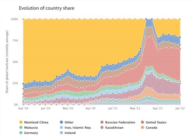 영국 케임브리지대 산하 CCAF(Cambridge Center for Alternative Finance)는 최신 비트코인 네트워크에서 해시레이트 국가별 차트를 경신했다. 2022년 1월 시점의 최신 데이터가 밝혀져 과거 세계 최대의 마이닝 집적지에서 한때 격감했던 중국의 점유율이 다시 증가하고 있음이 나타났다.