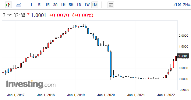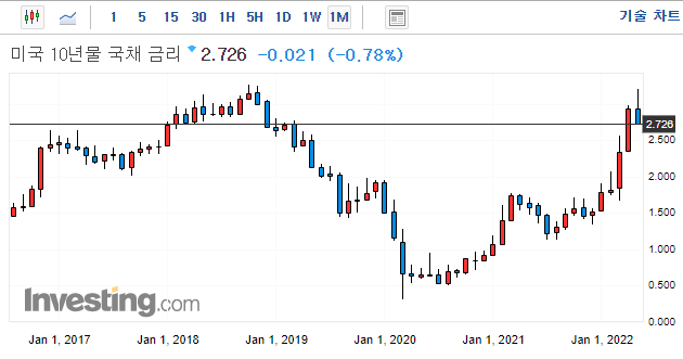 0.26%에서 0.01%상승한 0.27%마감 (22년 4월 1일 장단기 금리차 역전)