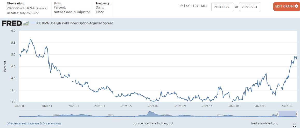 하이일드 채권 스프레드 : 하이일드 채권 수익률 에서 국채 수익률을 뺀 값으로, 이 값이 상승하면 시장이 위험하다는 신호로 볼 수 있습니다. 4% 이하로 하락해야 시장이 안정적인 것으로 판단합니다.