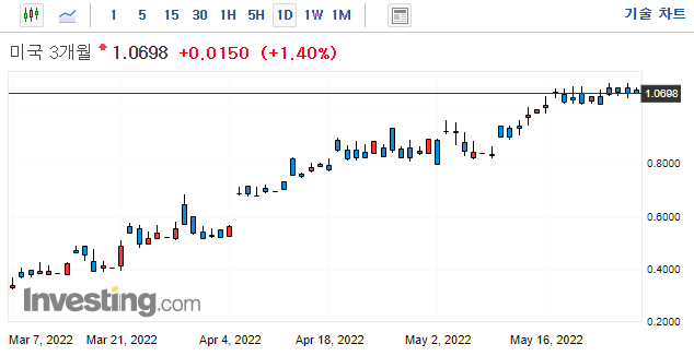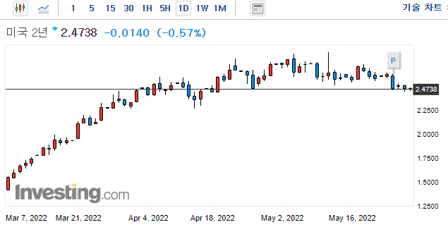 → 5월13일 현재 장단기 금리 가격들이 하락하고 있습니다.(=채권 가격의 상승) 채권 시장에 움직임만을 보면, 시장은 금리 인상으로 인한 경기 침체를 우려하며, 안전자산인 채권에 대한 투자가 증가하는 것으로 보입니다.