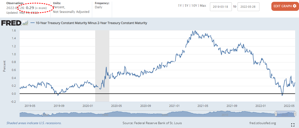 0.27%에서 0.02%상승한 0.29%마감 (22년 4월 1일 장단기 금리차 역전)