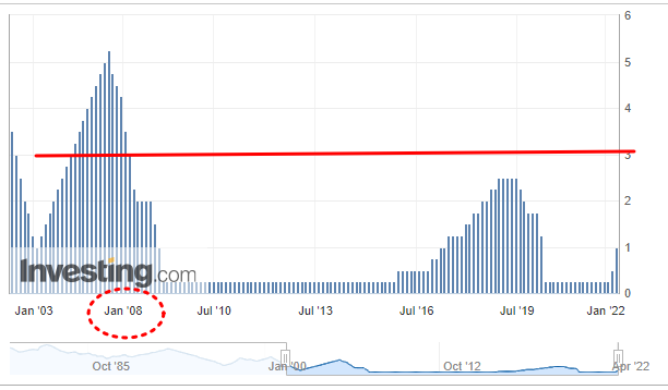 → 만약 인플레이션을 억제하기 위해 제임스 불라드에 주장처럼 금리가 3.125%까지 올려야한다면, 금리가 3.125%였던 시기인 2008년 1~2월에 10년물 금리는 3.519까지도 상승했다는 점까지 감안해야할 것 입니다.
