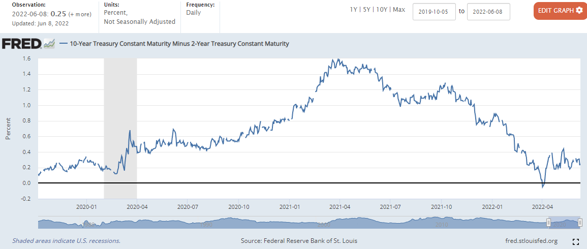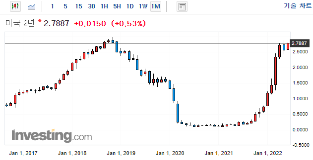 0.23%에서 0.02%상승한 0.25%마감 (22년 4월 1일 장단기 금리차 역전)