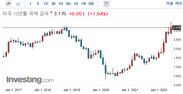 18년도에는 QT규모가 1500억 규모였으나, 이번 연준의 QT는 2200억 달러 규모입니다. 채권 수익률이 추가로 상승한다면, 이번 QT규모 만큼일텐데요. 이러한 상황에서 향후, 경기 침체를 우려가 깊어지면서, 채권 수익률을 누르는 압력으로 작용하는 모양입니다.
