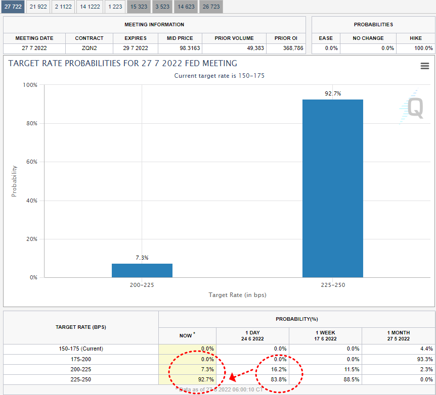 → 6월 15일 FedWatch에서 예상한대로, 금리를 0.75%(75bp) 인상하였습니다. 다음 금리결정 예정일은 7월 27일인데요. 현재 FedWatch에서는 또 한번 75bp를 인상할 것으로 예상하고 있습니다.