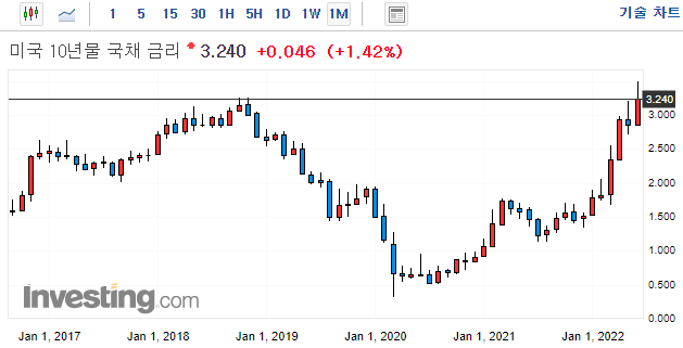 18년도에는 QT규모가 1500억 규모였으나, 이번 연준의 QT는 2200억 달러 규모입니다. 채권 수익률이 추가로 상승한다면, 이번 QT규모 만큼일텐데요. 이러한 상황에서 향후, 경기 침체를 우려가 깊어지면서, 채권 수익률을 누르는 압력으로 작용하는 모양입니다.