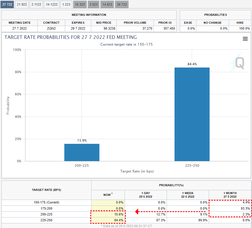 → 6월 15일 FedWatch에서 예상한대로, 금리를 0.75%(75bp) 인상하였습니다. 다음 금리결정 예정일은 7월 27일인데요. 현재 FedWatch에서는 또 한번 75bp를 인상할 것으로 예상하고 있습니다.