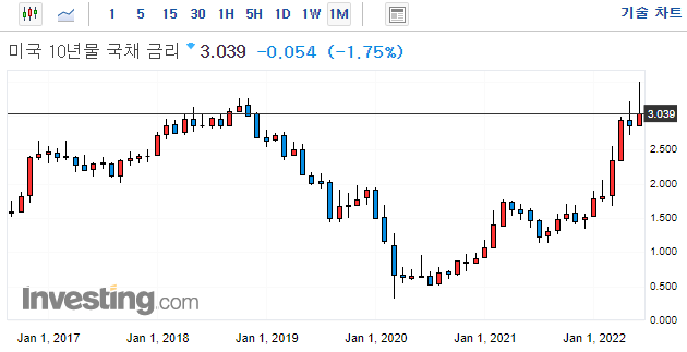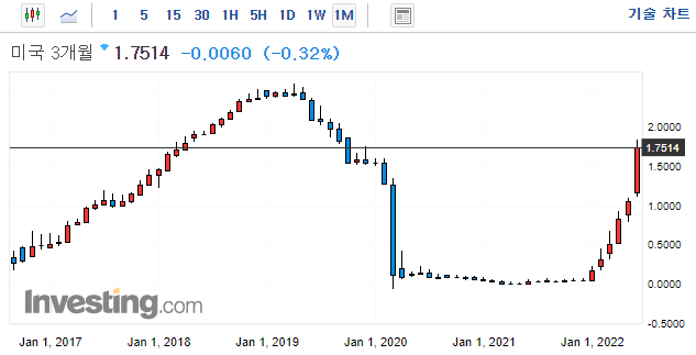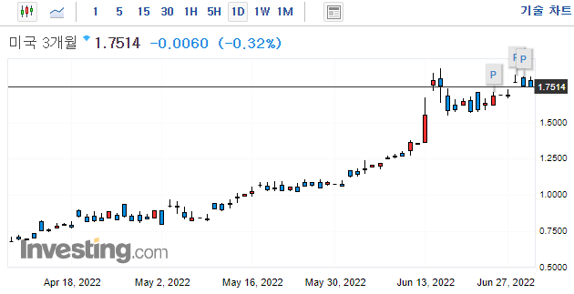 → 연말까지 3.0%~3.5%까지 기준금리를 올려야한다. (현재 1.75이므로 앞으로 3번의 FOMC 중 한번 정도 0.75인상이 더 있어야 기준 금리가 3.5%에 도달할 수 있으므로 시장은 이를 반영한 것으로 보임)