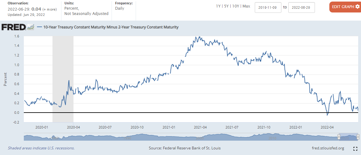 0.10%에서 0.06하락한 0.04%마감 (22년 4월 1일 장단기 금리차 역전)