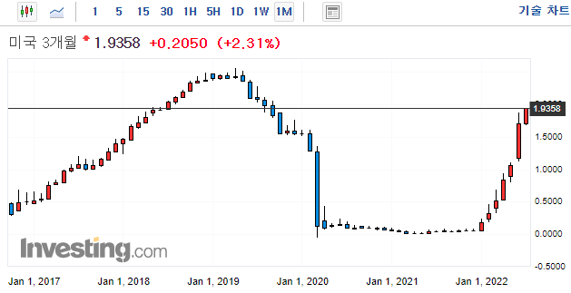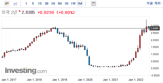 → 연말까지 3.0%~3.5%까지 기준금리를 올려야한다. (현재 1.75이므로 앞으로 3번의 FOMC 중 한번 정도 0.75인상이 더 있어야 기준 금리가 3.5%에 도달할 수 있으므로 시장은 이를 반영한 것으로 보임)