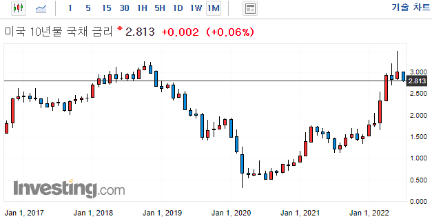 18년도에는 QT규모가 1500억 규모였으나, 이번 연준의 QT는 2200억 달러 규모입니다. 채권 수익률이 추가로 상승한다면, 이번 QT규모 만큼일텐데요. 이러한 상황에서 향후, 경기 침체를 우려가 깊어지면서, 채권 수익률을 누르는 압력으로 작용하는 모양입니다.