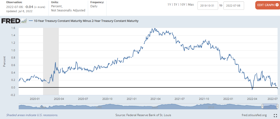 0.00%에서 0.04하락한 -0.04%마감 (22년 4월 1일과 7월 6일 장단기 금리차 역전)