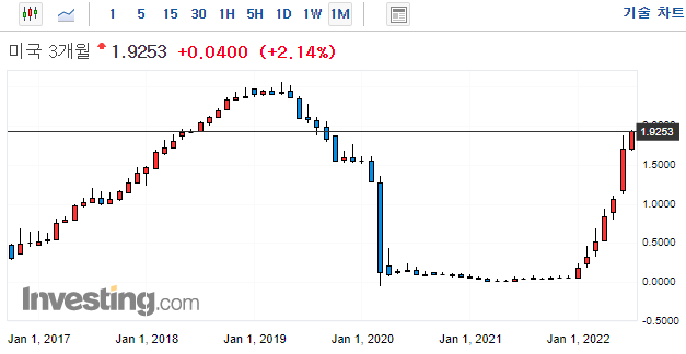 → 연말까지 3.0%~3.5%까지 기준금리를 올려야한다. (현재 1.75이므로 앞으로 3번의 FOMC 중 한번 정도 0.75인상이 더 있어야 기준 금리가 3.5%에 도달할 수 있으므로 시장은 이를 반영한 것으로 보임)