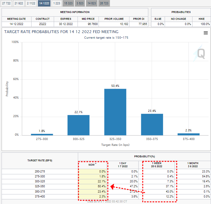 → 7월 1일 미국 시장이 경기침체에 대한 우려감이 커지면서, 미 연준이 금리 인상 속도를 늦출 것이라는 의견이 늘어나고 있습니다. 이를 반영하듯 22년 12월 미국 기준금리에 대한 FedWatch의 예측값이 크게 변하였습니다.