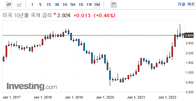 18년도에는 QT규모가 1500억 규모였으나, 이번 연준의 QT는 2200억 달러 규모입니다. 채권 수익률이 추가로 상승한다면, 이번 QT규모 만큼일텐데요. 이러한 상황에서 향후, 경기 침체를 우려가 깊어지면서, 채권 수익률을 누르는 압력으로 작용하는 모양입니다.