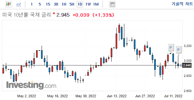 -0.07%에서 0.15하락한 -0.22%마감 (22년 4월 1일과 7월 6일 장단기 금리차 역전)