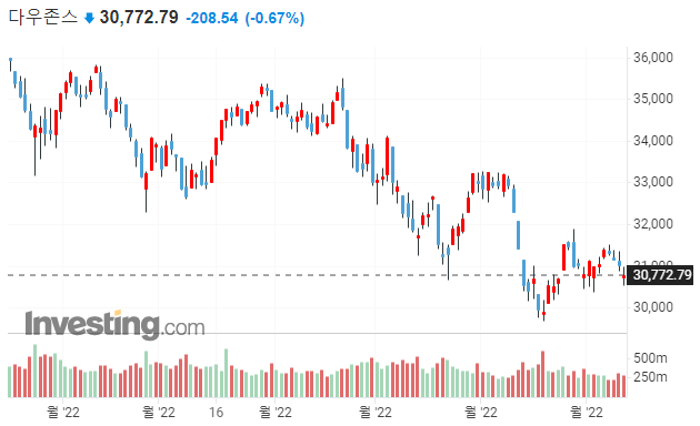 다우 -0.67% / S&P500 -0.45% / 나스닥 -0.15% / 러셀 2000 -0.16%