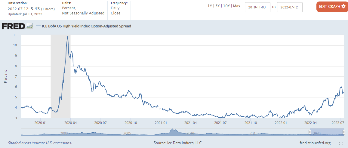 하이일드 채권 스프레드 : 하이일드 채권 수익률 에서 국채 수익률을 뺀 값으로, 이 값이 상승하면 시장이 위험하다는 신호로 볼 수 있습니다. 4% 이하로 하락해야 시장이 안정적인 것으로 판단합니다.