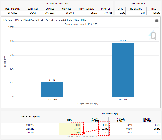 → 아래 FedWatch에서도 7월 27일 연준이 기준금리를 75~100bp인상 예상 확률이 13일 이후 급격히 상승했습니다.