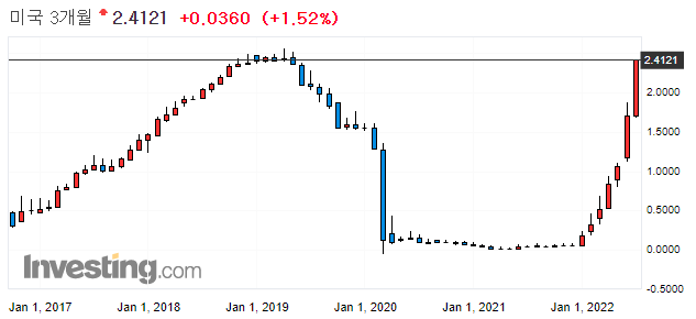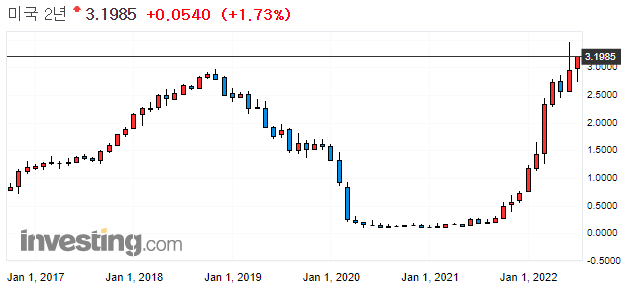 → 연말까지 3.0%~3.5%까지 기준금리를 올려야한다. (현재 1.75이므로 앞으로 3번의 FOMC 중 한번 정도 0.75인상이 더 있어야 기준 금리가 3.5%에 도달할 수 있으므로 시장은 이를 반영한 것으로 보임)