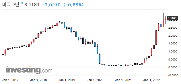 → 연말까지 3.0%~3.5%까지 기준금리를 올려야한다. (현재 1.75이므로 앞으로 3번의 FOMC 중 한번 정도 0.75인상이 더 있어야 기준 금리가 3.5%에 도달할 수 있으므로 시장은 이를 반영한 것으로 보임)