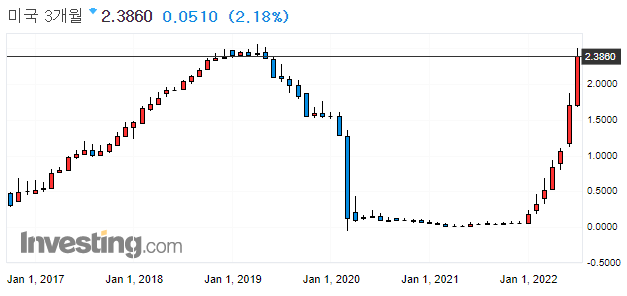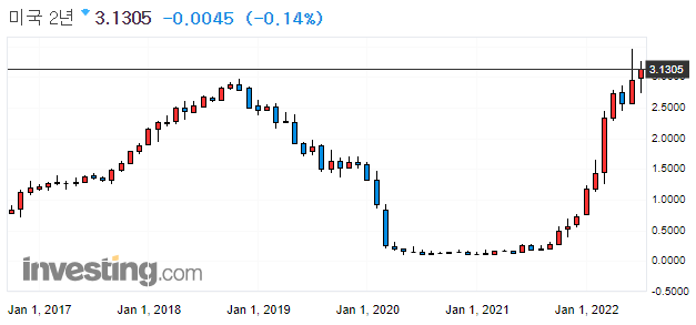 → 연말까지 3.0%~3.5%까지 기준금리를 올려야한다. (현재 1.75이므로 앞으로 3번의 FOMC 중 한번 정도 0.75인상이 더 있어야 기준 금리가 3.5%에 도달할 수 있으므로 시장은 이를 반영한 것으로 보임)