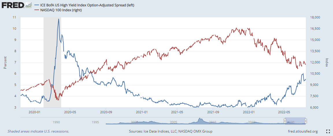 하이일드 채권 스프레드 : 하이일드 채권 수익률 에서 국채 수익률을 뺀 값으로, 이 값이 상승하면 시장이 위험하다는 신호로 볼 수 있습니다. 4% 이하로 하락해야 시장이 안정적인 것으로 판단합니다.