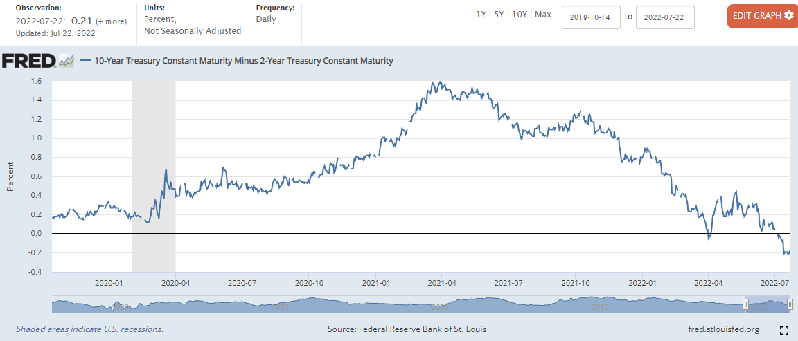 -0.21%에서 0.00상승한 -0.21%마감 (22년 4월 1일과 7월 6일 장단기 금리차 역전)