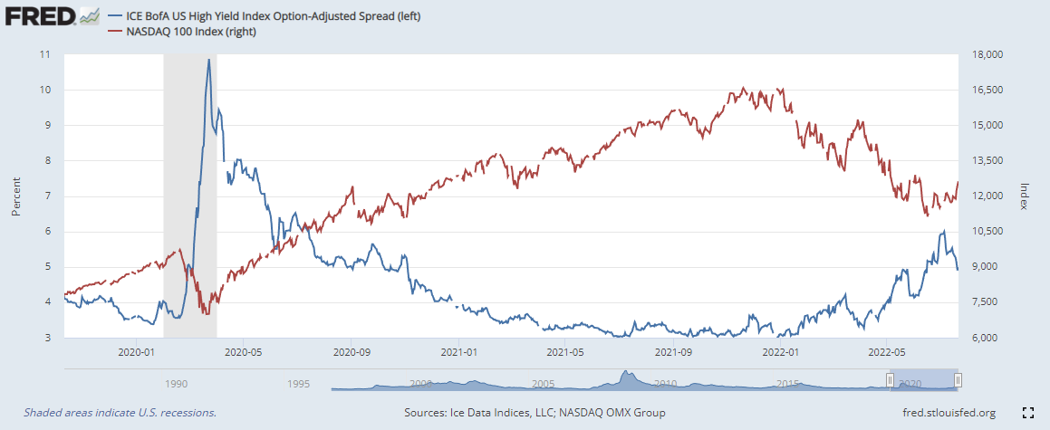 하이일드 채권 스프레드 : 하이일드 채권 수익률 에서 국채 수익률을 뺀 값으로, 이 값이 상승하면 시장이 위험하다는 신호로 볼 수 있습니다. 4% 이하로 하락해야 시장이 안정적인 것으로 판단합니다.