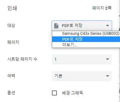 6. 인쇄를 누른 후, 인쇄 페이지에서 [대상]을 프린터명을 선택 후, 인쇄하면 A4용지에 출력하실 수 있습니다.반면 컴퓨터에 저장하고 싶다면 [PDF로 저장]을 선택하신 후, 저장을 누르시면, 컴퓨터에 PDF파일로 저장되므로 인터넷상에 쉽게 업로드가 가능합니다.