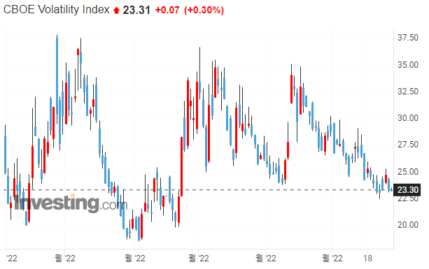 ▷VIX지수가 23.39까지 하락하였습니다. 공포 탐욕 지수도 42로 많이 호전된 상황인데요. 경기침체 우려가 현실화되면서, 오히려 경기침체를 우려한 Fed가 더 이상 금리를 인상하지 못할 것이라는 기대가 커지고 있는 상황입니다.