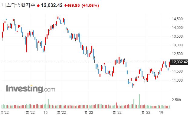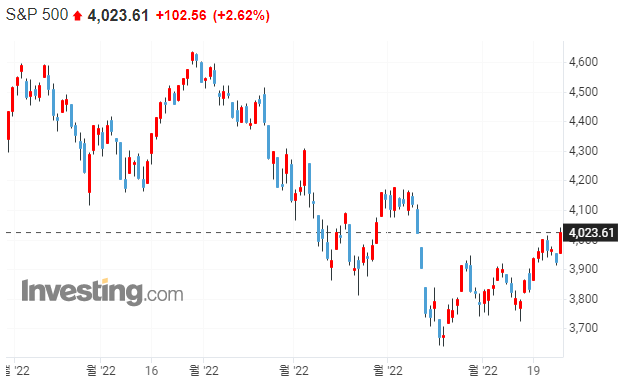→ 시장은 파월 연준 의장에 말을 신뢰하는 것으로 보입니다. S&P가 강한 저항선이였던 4,000을 뚫고 상승하는 모습을 보였습니다. 다만 큰 거래량을 동반한 것은 아니므로 앞으로 상승세를 이어갈지는 지켜봐야할 것 같습니다.