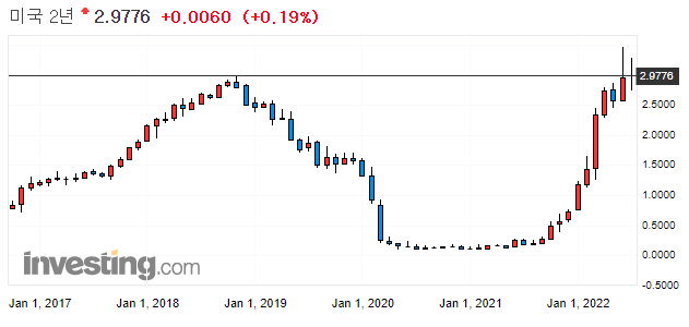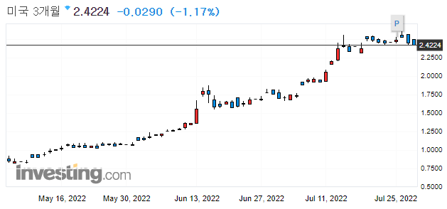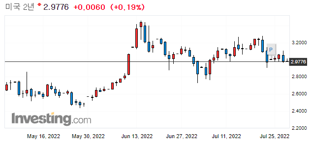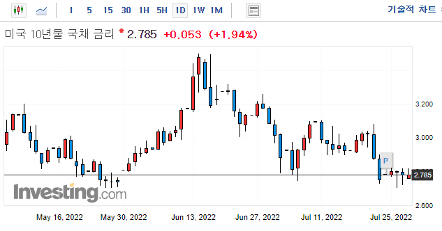 → 7월 26일 채권 수익률이 상승했습니다.(=채권 가격 하락), 한국 시각으로 7월 28일 새벽 3시가 미국 금리결정일인데요. 75bp인상이 당연시 되는 현 상황에서 2년물 채권 수익률 가격이 오르는 것은 당연한 반응으로 보입니다. 하지만, 이후 QT로 인해 채권 수익률 상승 추세가 계속될지 아니면, 경기침체 공포로 인해 채권 가격이 상승하면서 수익률 상승세가 꺾일지는 좀 더 지켜봐야할 것 같습니다.