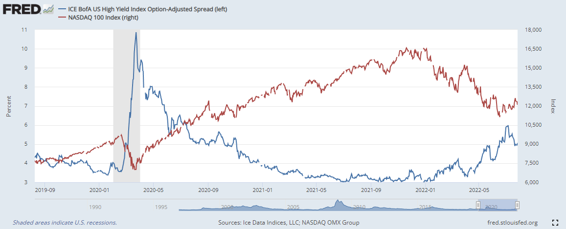 하이일드 채권 스프레드 : 하이일드 채권 수익률 에서 국채 수익률을 뺀 값으로, 이 값이 상승하면 시장이 위험하다는 신호로 볼 수 있습니다. 4% 이하로 하락해야 시장이 안정적인 것으로 판단합니다.