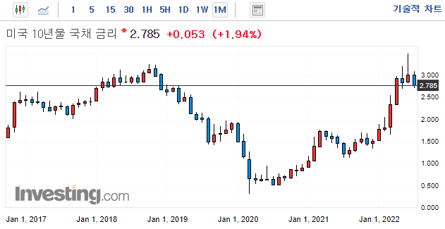 18년도에는 QT규모가 1500억 규모였으나, 이번 연준의 QT는 2200억 달러 규모입니다. 채권 수익률이 추가로 상승한다면, 이번 QT규모 만큼일텐데요. 이러한 상황에서 향후, 경기 침체를 우려가 깊어지면서, 채권 수익률을 누르는 압력으로 작용하는 모양입니다.