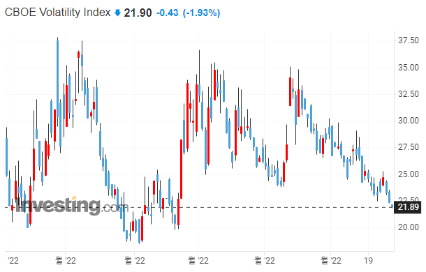 ▷VIX지수가 23.39까지 하락하였습니다. 공포 탐욕 지수도 42로 많이 호전된 상황인데요. 경기침체 우려가 현실화되면서, 오히려 경기침체를 우려한 Fed가 더 이상 금리를 인상하지 못할 것이라는 기대가 커지고 있는 상황입니다.