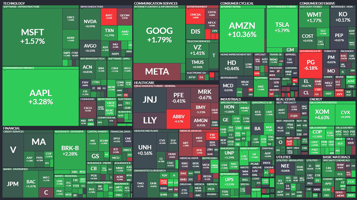 쉐브론,엑손모빌— 에너지주는 유가 상승과 가스 가격 상승에 힘입어 2분기 실적에서 보고된 기록적인 이익 에 힘입어 급등했습니다. 셰브론은 8.9%, 엑손모빌은 4.6% 올랐다.