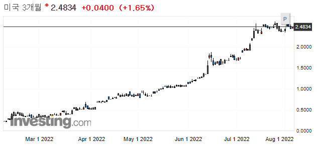 → 7월 28일 미국 GDP가 2분기 연속 마이너스를 기록하였습니다. 2분기 연속 GDP가 마이너스인 경우 경기 침체로 보는데요. 채권 가격의 상승(=채권 수익률 하락)하는 모습을 통해 채권 시장은 경기 침체에 더 무게를 두고 있다는 것을 알 수 있습니다.