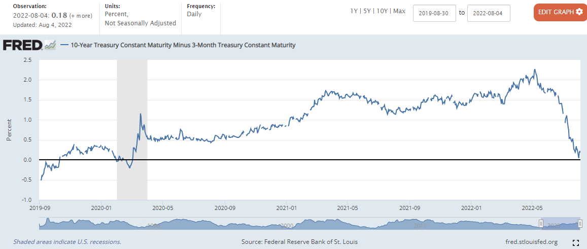 → 연준에서는 항상 10년물과 3개월물에 차이를 중요하게 언급했었습니다. 8월 1일 기준 10년물과 3개월물 금리차가 0.04로 역전되기 직전입니다.
