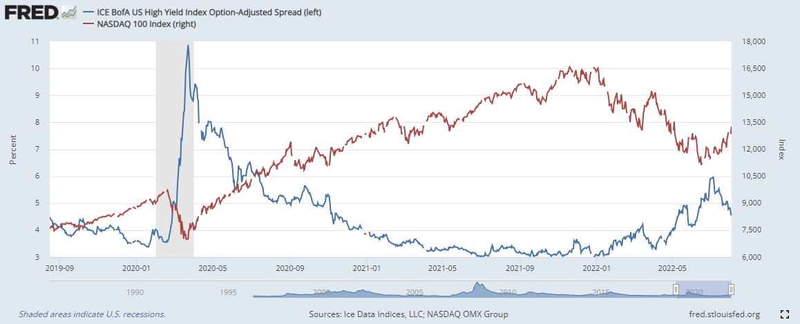 하이일드 채권 스프레드 : 하이일드 채권 수익률 에서 국채 수익률을 뺀 값으로, 이 값이 상승하면 시장이 위험하다는 신호로 볼 수 있습니다. 4% 이하로 하락해야 시장이 안정적인 것으로 판단합니다.