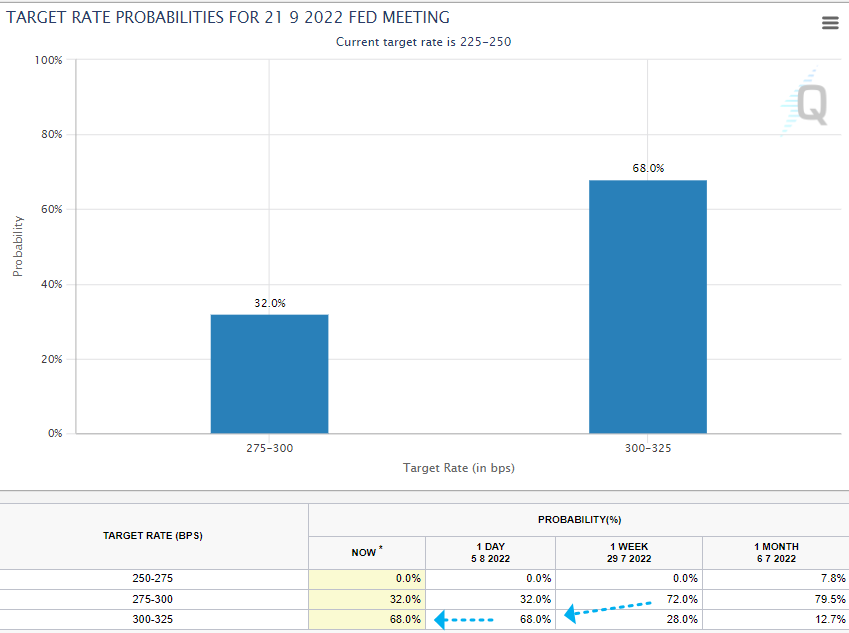 → 8월 5일 고용 지수들이 굉장히 높게 나타나고 있습니다. [높은 고용률]은 현재 미국이 경기 침체 상황이 아니라는 것을 보여주지만, 반대로 [높은 고용률] → [높은 임금상승] → [인플레이션 상승] → [연준의 긴축 강화]를 의미하게됩니다. 따라서 이러한 인플레이션을 억제하기 위해 Fed가 9월에 75bp를 올려야할 것 이라고 예상하는 것 입니다.