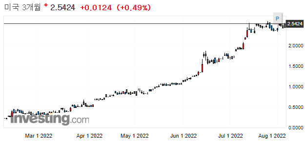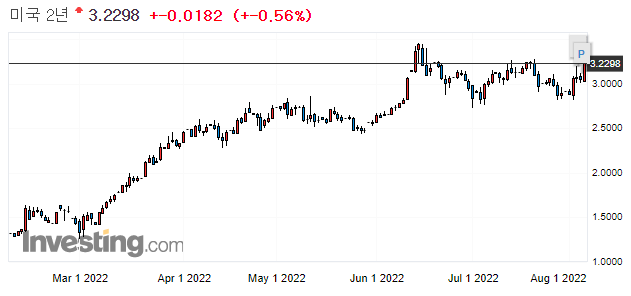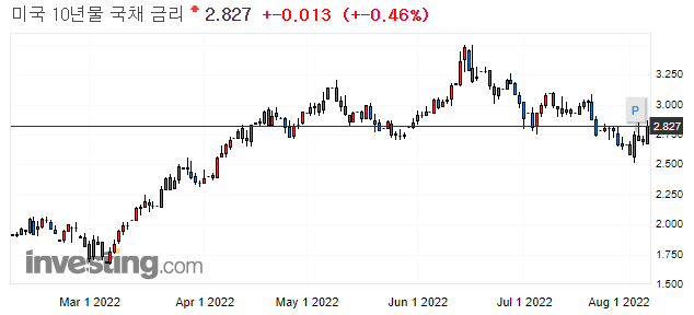 → 7월 28일 미국 GDP가 2분기 연속 마이너스를 기록하였습니다. 2분기 연속 GDP가 마이너스인 경우 경기 침체로 보는데요. 채권 가격의 상승(=채권 수익률 하락)하는 모습을 통해 채권 시장은 경기 침체에 더 무게를 두고 있다는 것을 알 수 있습니다.