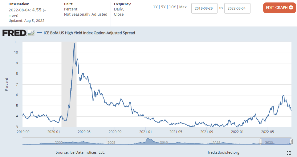 하이일드 채권 스프레드 : 하이일드 채권 수익률 에서 국채 수익률을 뺀 값으로, 이 값이 상승하면 시장이 위험하다는 신호로 볼 수 있습니다. 4% 이하로 하락해야 시장이 안정적인 것으로 판단합니다.