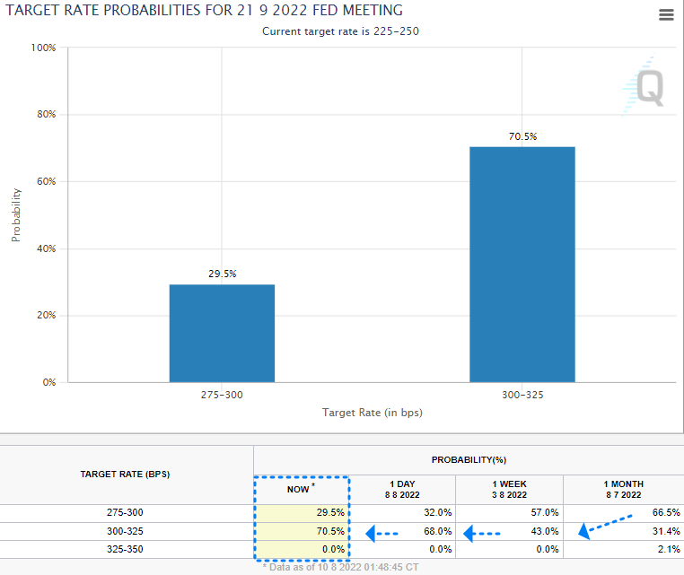 → 8월 5일 고용 지수들이 굉장히 높게 나타나고 있습니다. [높은 고용률]은 현재 미국이 경기 침체 상황이 아니라는 것을 보여주지만, 반대로 [높은 고용률] → [높은 임금상승] → [인플레이션 상승] → [연준의 긴축 강화]를 의미하게됩니다. 따라서 이러한 인플레이션을 억제하기 위해 Fed가 9월에 75bp를 올려야할 것 이라고 예상하는 것 입니다.
