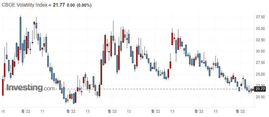 ▷VIX지수가 23.39까지 하락하였습니다. 공포 탐욕 지수도 42로 많이 호전된 상황인데요. 경기침체 우려가 현실화되면서, 오히려 경기침체를 우려한 Fed가 더 이상 금리를 인상하지 못할 것이라는 기대가 커지고 있는 상황입니다.